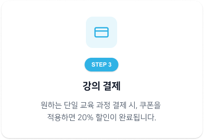 – 단일 교육 과정에 한하여 적용되며, 강의 연장, 패키지 과정 등 기타 과정 및 상품에는 적용이 불가합니다.