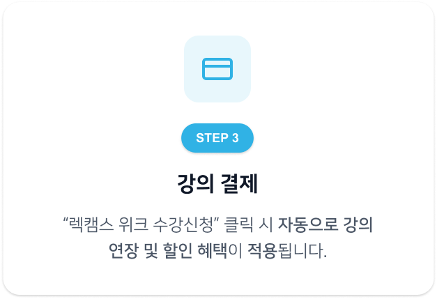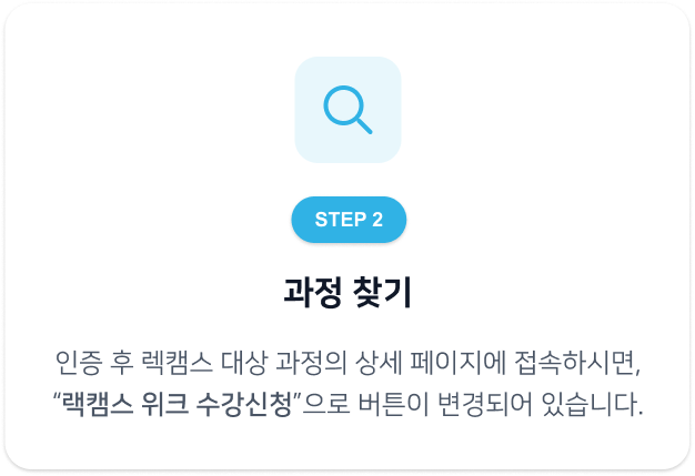 – “렉캠스 위크 수강신청” 버튼으로 변경되지 않을 경우, 로그인 상태 및 캠퍼스 인증 여부를 다시 한번 확인해주세요.